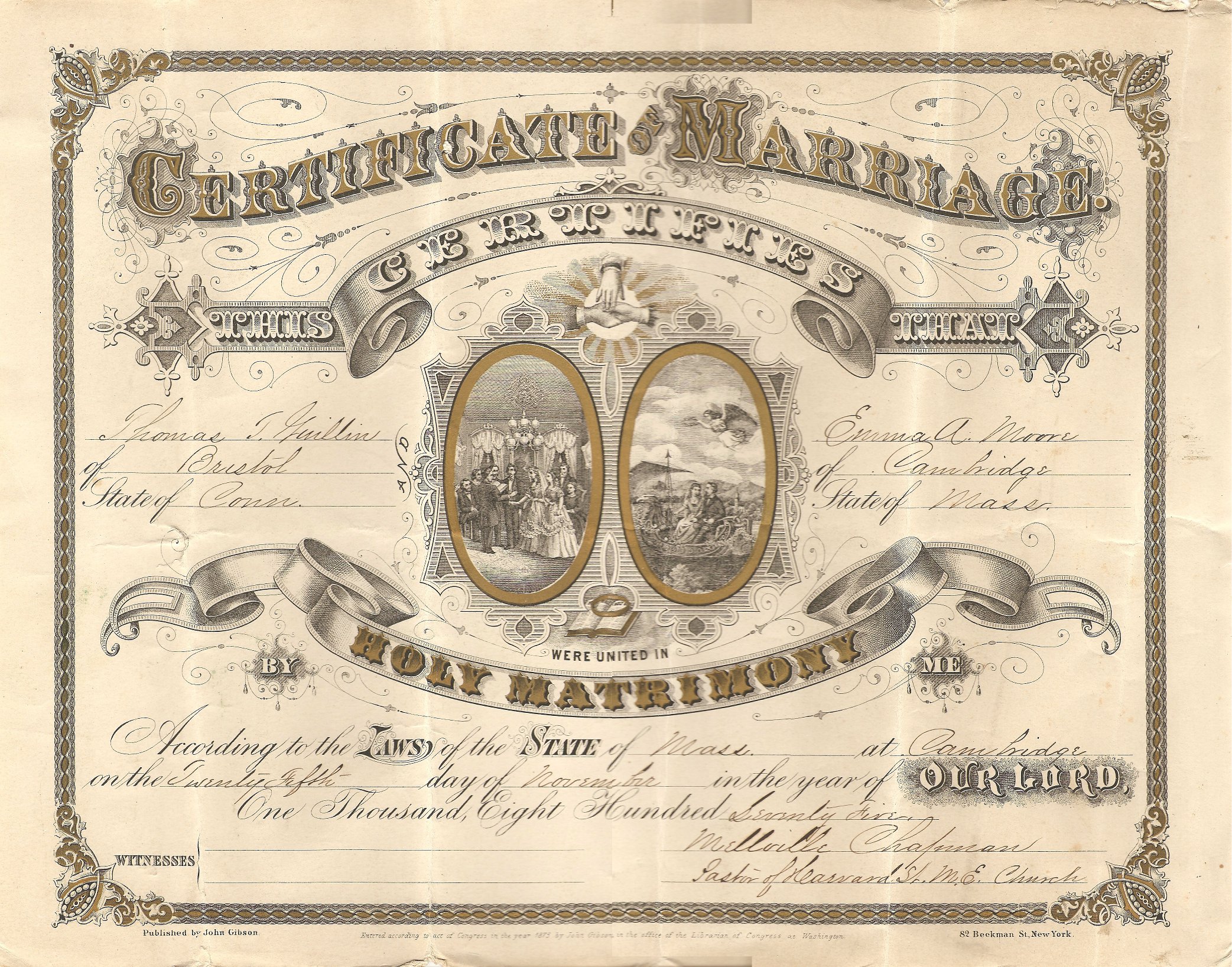 Certificate of Marriage. This certifies that Thomas I. Gwillim of Bristol State of Conn. Emma A. Moore of Cambridge State of Mass. were united in holy matrimony by me According to the laws of the State of Mass. at Cambridge on the Twenty-Fifth day of November in the year of Our Lord One Thousand Eight Hundred Seventy-Five Witnesses Mellville Chapman Pastor of Harvard St. M. E. Church